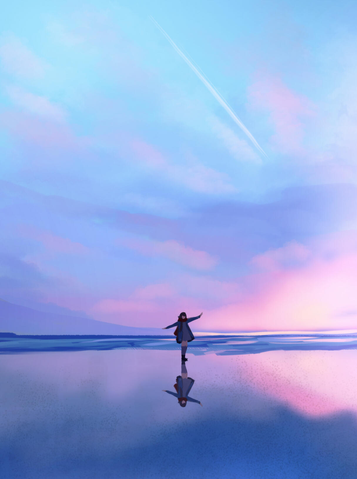 Half body or full body rendered illustration with a character that focuses on background and/or composition.